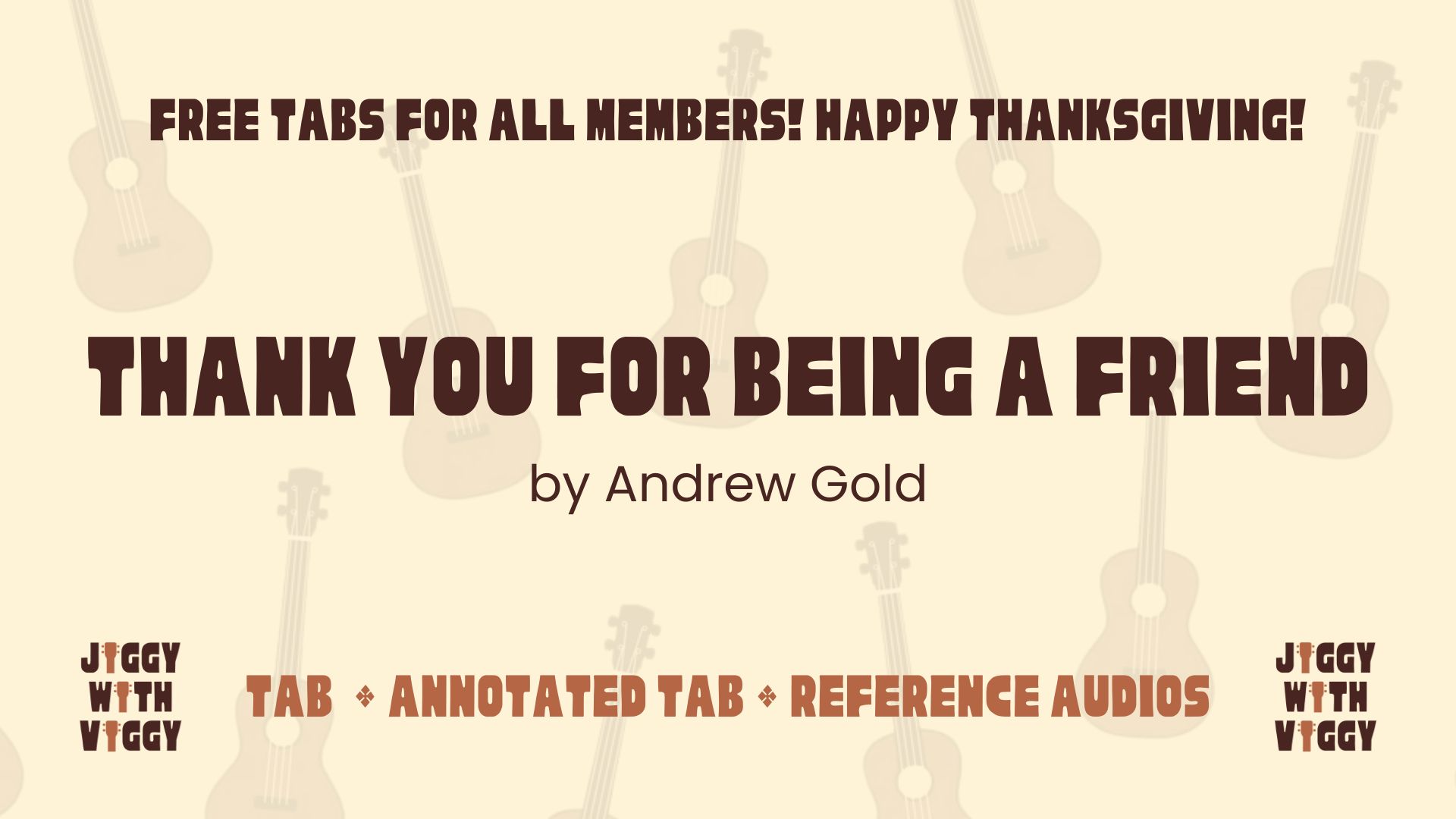 As a thank you for following along on my jiggy journey, Iβm giving all newsletter subscribers and patreon pals of all levels some free ukulele tabs! Very fitting for the holiday, learn how to play Thank You for Being a Friend by Andrew Gold (aka The Golden Girls theme song). Check out my cover of it from my Instagram: